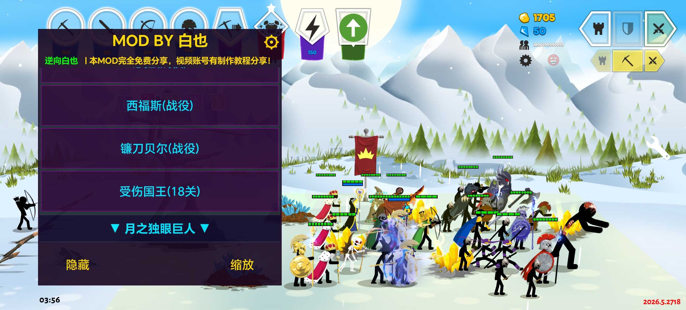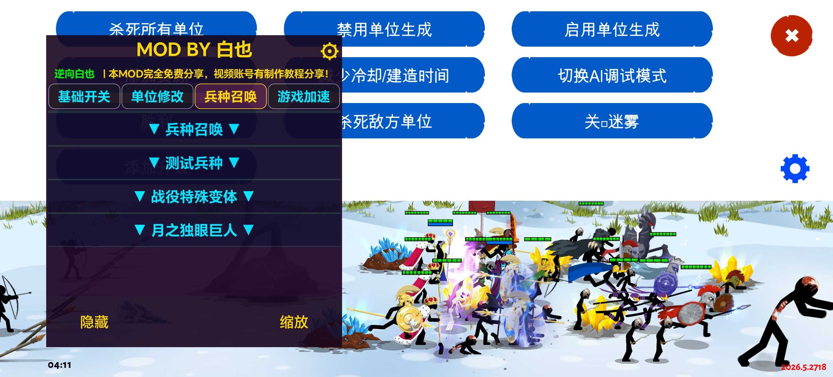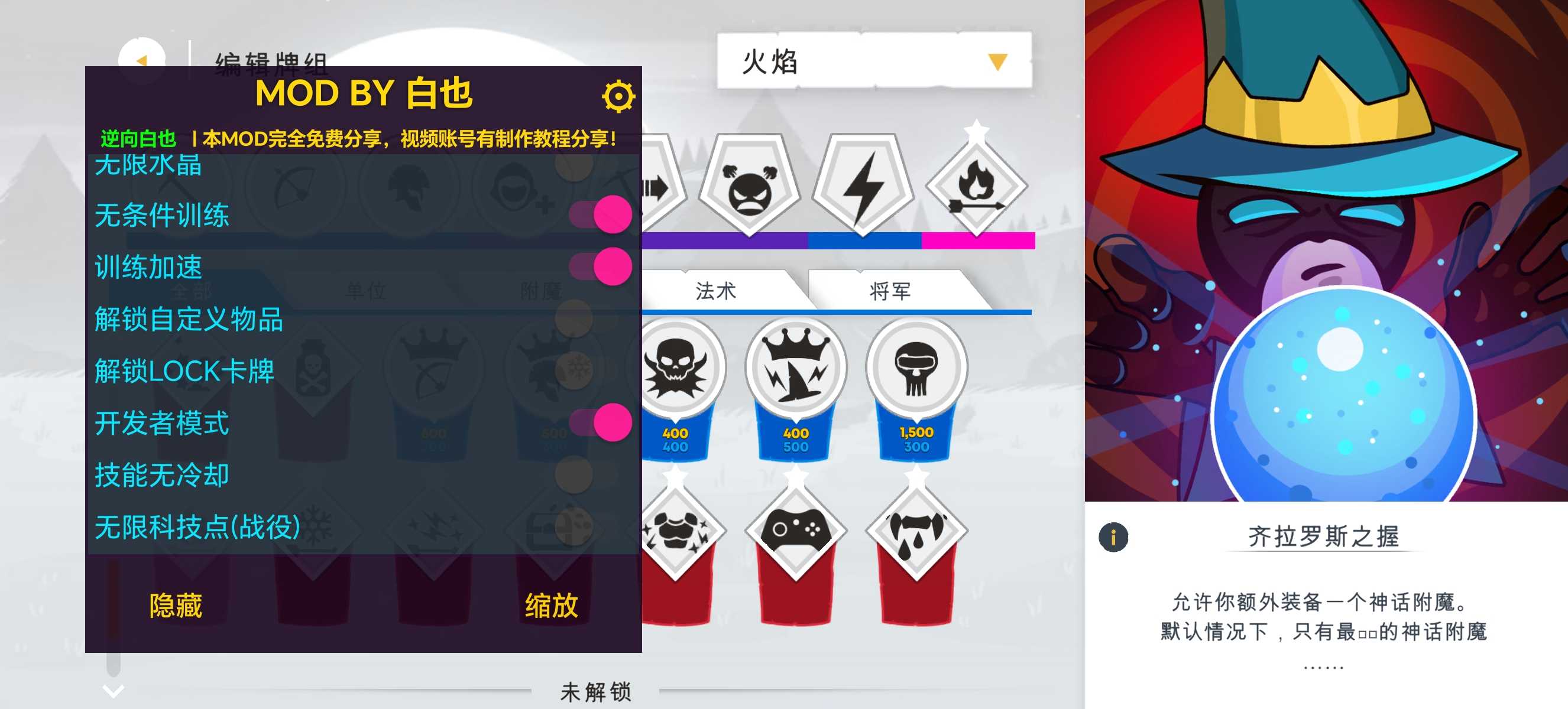 白也菜单最新版,菜单有以下功能:一健开启,无限金币,无限水晶,无限人口,无条件训练,训练加速,解锁自定义物品,解锁卡牌,开发者模式,技能无泠却