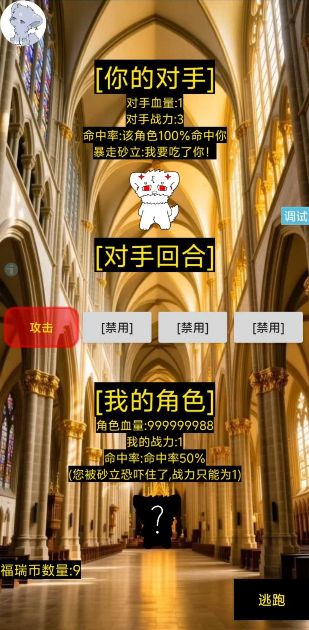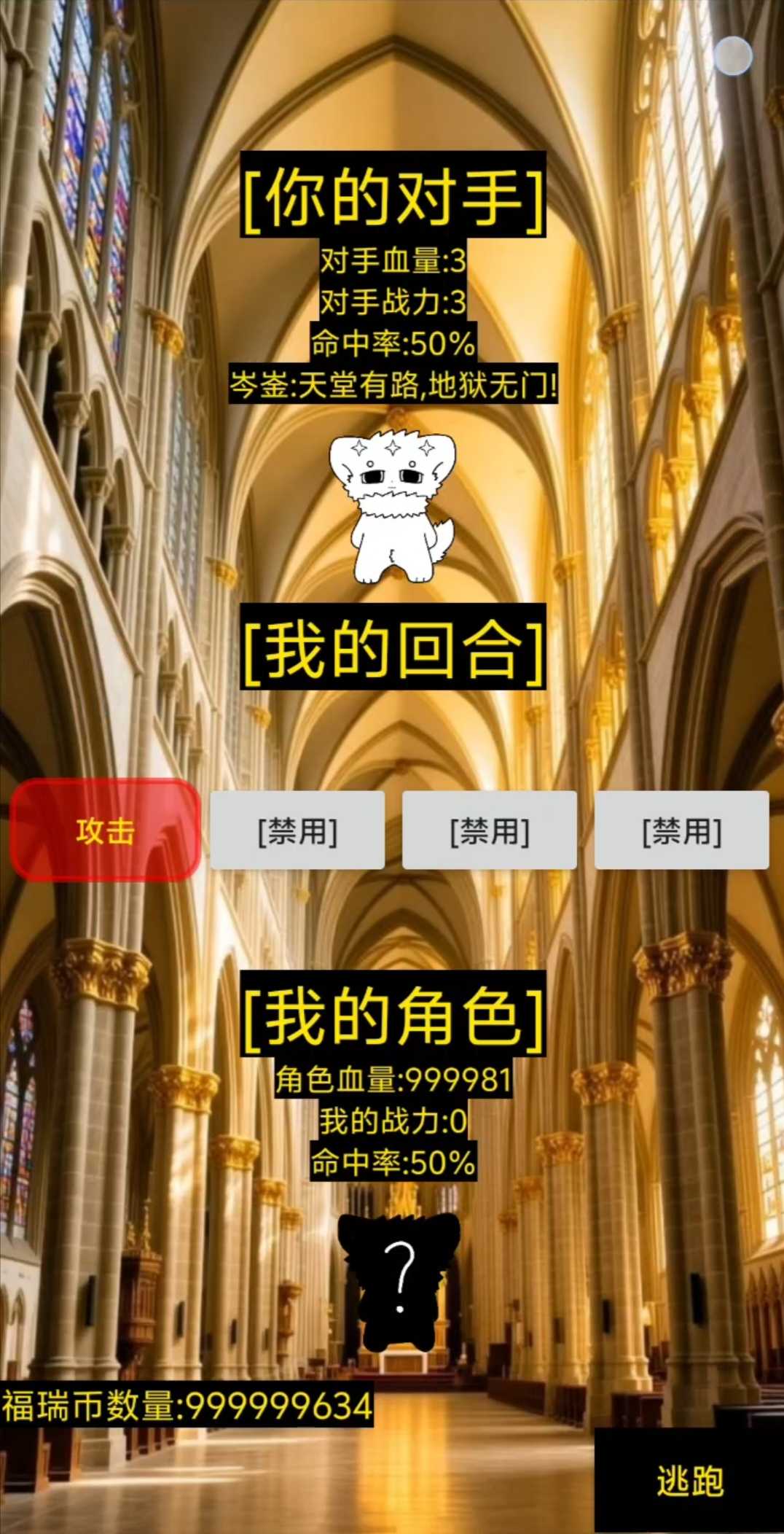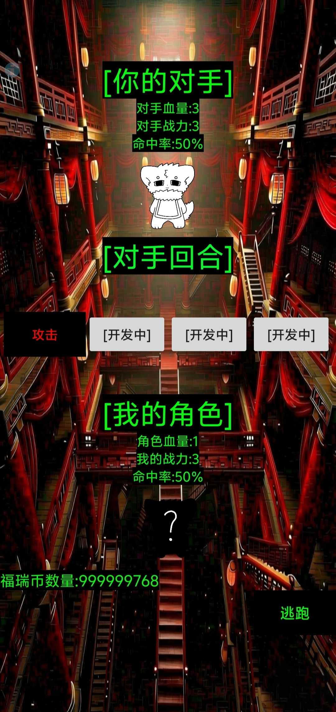 [游戏介绍]:这是一款回合制角色扮演卡牌类赌命游戏,一个靠运气、血量、战力攻击对手赢得战斗奖励的回合制抽卡游戏目前还在开发中,欢迎测试游玩,快来试一试吧 [游戏更新内容] 版本3.33更新内容 新增三款不同的挑战角色(超能k9,dr博士,暴走砂立(一阶),三种不同的对话内容,暴走砂立(一阶)拥有特殊挑战限制 版本3.3更新内容:新增三款挑战角色(dr博士,砂立,岑崟)新增练习模式,新的地图(神圣教堂),更新了抽奖界面背景图,增加按钮背景装饰,新增岑崟挑战时的开场白和对话系统,让战不再无聊,增加天选阁和神圣教堂专有bgm 版本2.99更新内容:更新了主页面背景,选择地图背景,天选阁地图背景,更新两只挑战角色(兜兜,篷篷),暂时移除五血岑崟,降低幽灵狼血量为1血,新的武器[杀虫剂]装备战力会增加2点,获取方式在商店里就可以买到,优化战斗界面卡顿的问题 版本2.66更新内容:更新了主题音乐,初始角色幽灵狼的设置系统,新手关卡三血量幽灵狼对手,咸鱼武器商品以及装备,命中率显示,修复已知bug,新增解锁角色显示