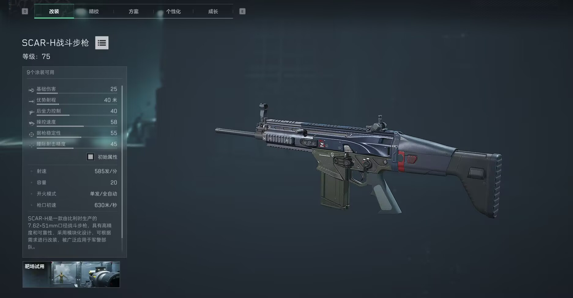熟悉SCAR-H的玩家都会有一个共识那就是“稳!”,但这把枪基础后坐力控制只有40,这我们就不得不说到SCAR-H与生俱来的585发/分的低射速和55点的据枪稳定性,它让这把枪在射击时可控性大大增加。因此,我们对于这把枪的改装思路是取长补短。