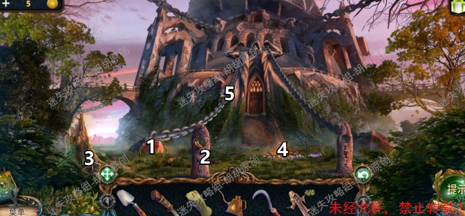 3.先收集物品,图中1位置获得铲子,2位置获得梯子,将梯子架在3处爬上去,红框处获得刀柄,鸟巢里有钥匙,提示需要把鸽子引出来才能拿到4.下梯子,继续寻找线索,图中4对刀使用刀柄,获得刀子和一张马龙隐士的介绍,先收起来,想看的时候可以点击左下角黄框阅读