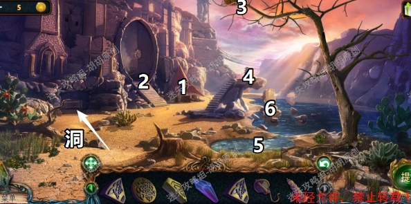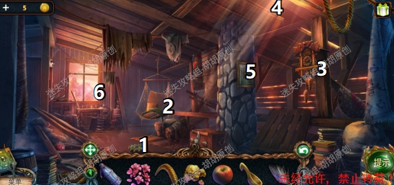 104.木屋阁楼内,1处获得闭锁机构齿轮,2处获得发光水药水配方,3处点击获得小瓶,4处获得圆刷子,5处使用圆刷子,点击6进入 104 104.1