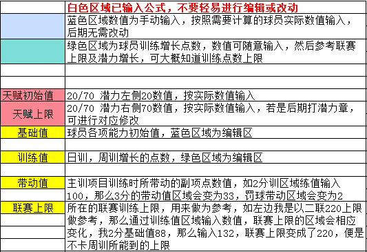 新手礼包的21天支持者到期了,只拿首充和对照着官方模拟都能卡周训出错的我,只能连夜赶制了球员模拟训练表格,虽然没能精准到零点几,但误差1.5以内应该没问题,潜力兑现通过论坛找到的资源和我通过球员模拟数值计算出的略有出入,我按照球员模拟同数值输入了一遍,误差值±1,虽然单项计算器也能敲,但是做出表格来球员整体一目了然而且一劳永逸,就是球员评分还不知道怎么弄