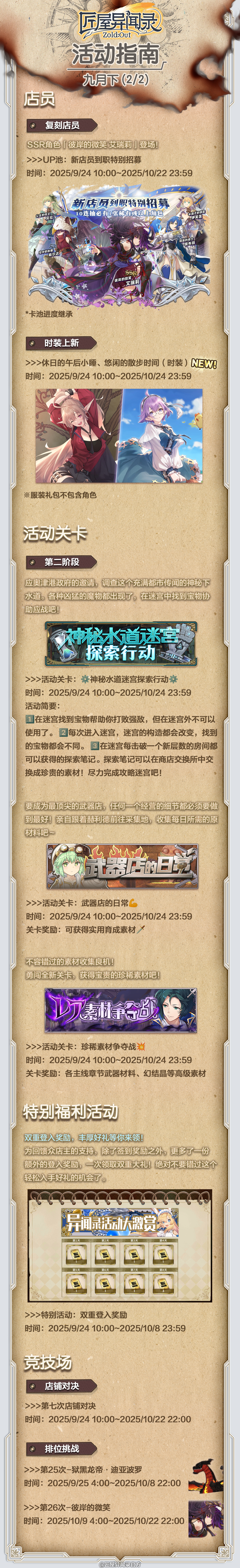 全新活动「神秘水道迷宫探索」同步开放,挑战随机迷宫获取宝物,更有其他活动关卡助你收集养成材料。双重登入奖励等你来领取!第二阶段活动同样精彩,诚邀各位店主前来体验!