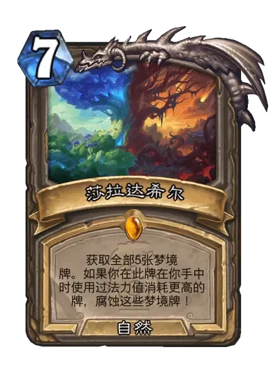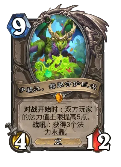 伊瑟拉,翡翠守护巨龙也是漫游翡翠梦境常见卡牌之一,该卡为控制卡组及后期卡组的万金油神卡,可以将法力水晶上限提高到15费,且9费可以直接获得三个法力水晶,后期不论是配合otk还是裸拍都是比较赚的。