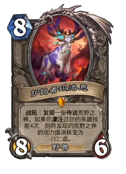 基本上灌注卡组都会带护路者玛洛恩,其提供的1费荒野之神强度很高,可以给卡组带来额外的厚度。版本初期爆火的摩摩尔萨也会携带玛洛恩完成中期启动后的超展开。