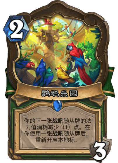 在这套战吼众多的卡组当中,鹦鹉乐园就是毋庸置疑的神卡,上限是三费丢出三张二费战吼牌,跳费让抱龙王提前一回合被复制下来斩杀等等都彰显了其不可替代的功能性。