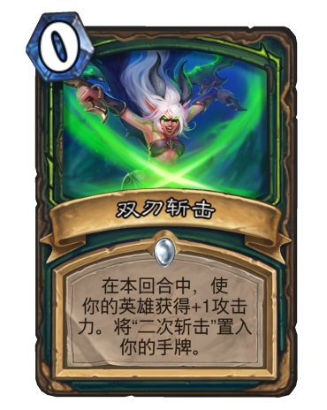 也可以用疾影甚至幸运币来代替这个位置。但是这张牌不仅可以作为铺垫,其衍生物“二次斩击”也是一张相同类似的0费卡牌。一卡当二卡打,虽然效果不强,但是配合起来不可估量。