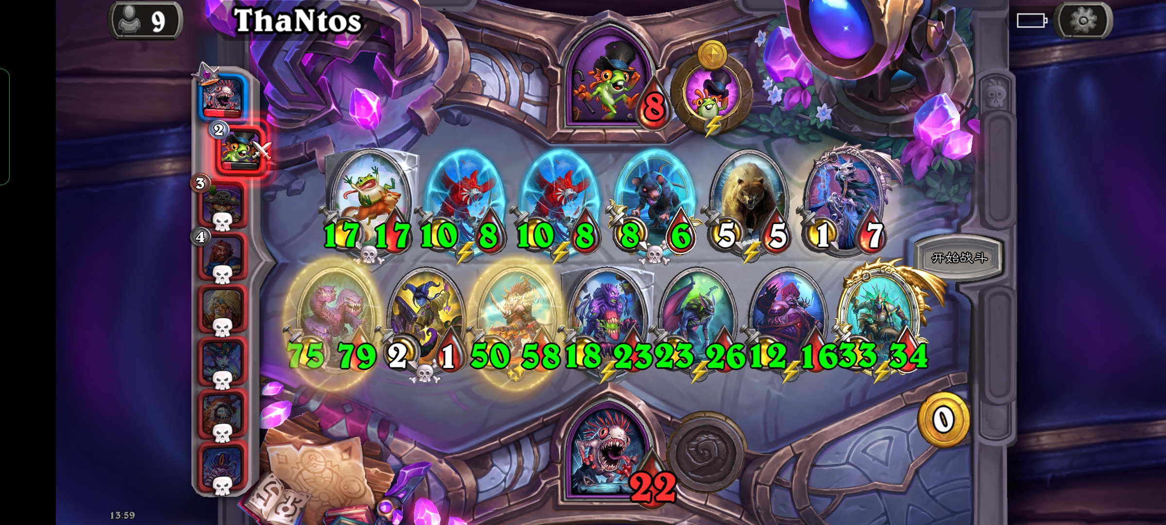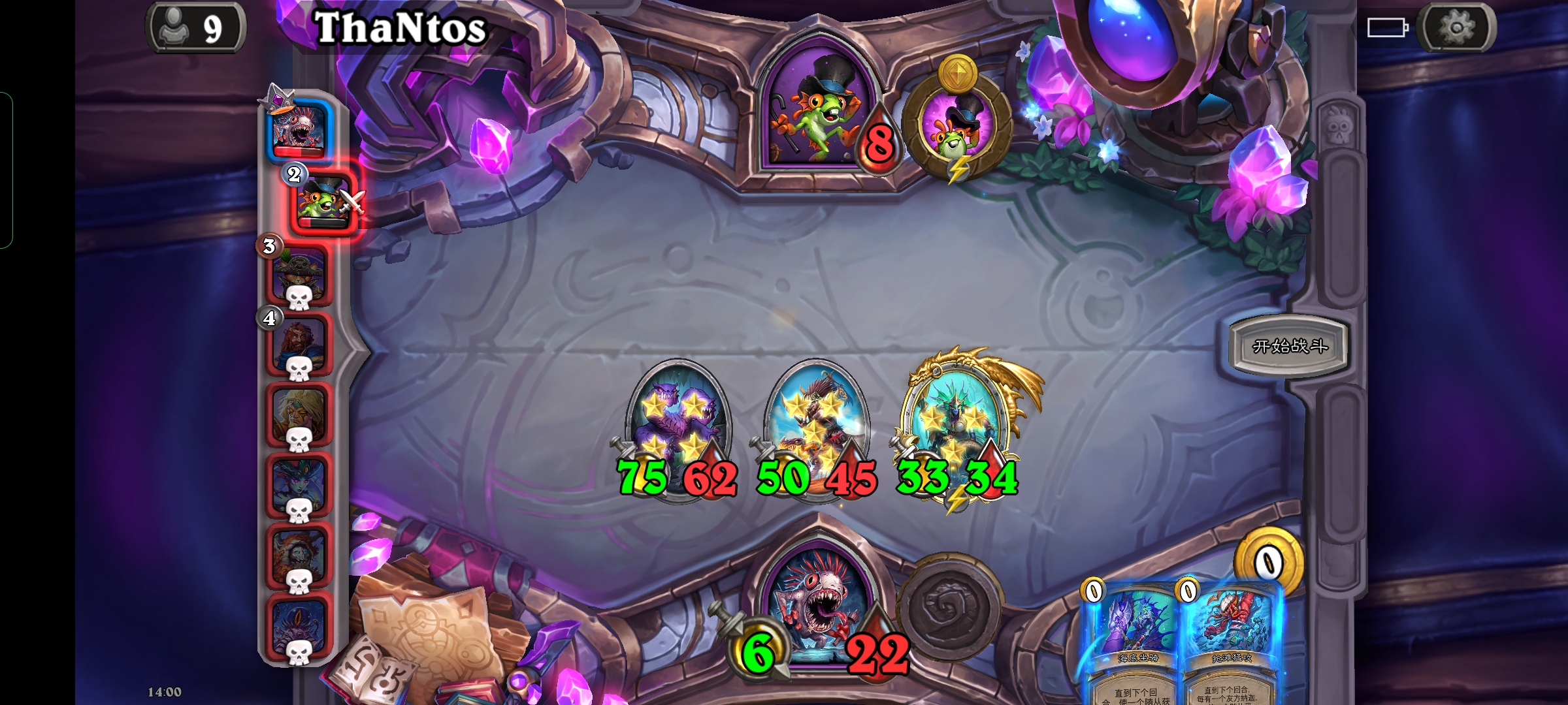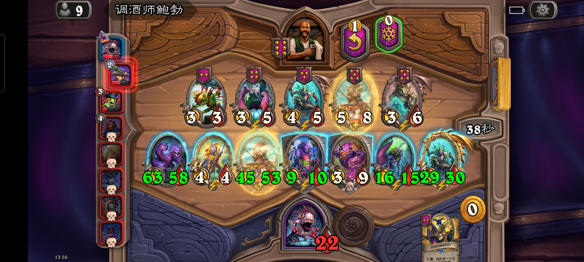 之后又买多了个4-5纳迦,用技能把小费酒客也给吃了,之后每回合买一个大一点的身材怪,利用4-5纳迦法术给它加身材,再用技能吃掉,基本上是稳血了,后面鲍勃直接三张光牙发脸,碰了一个蝙蝠,就又拿了一个乌祖尔
