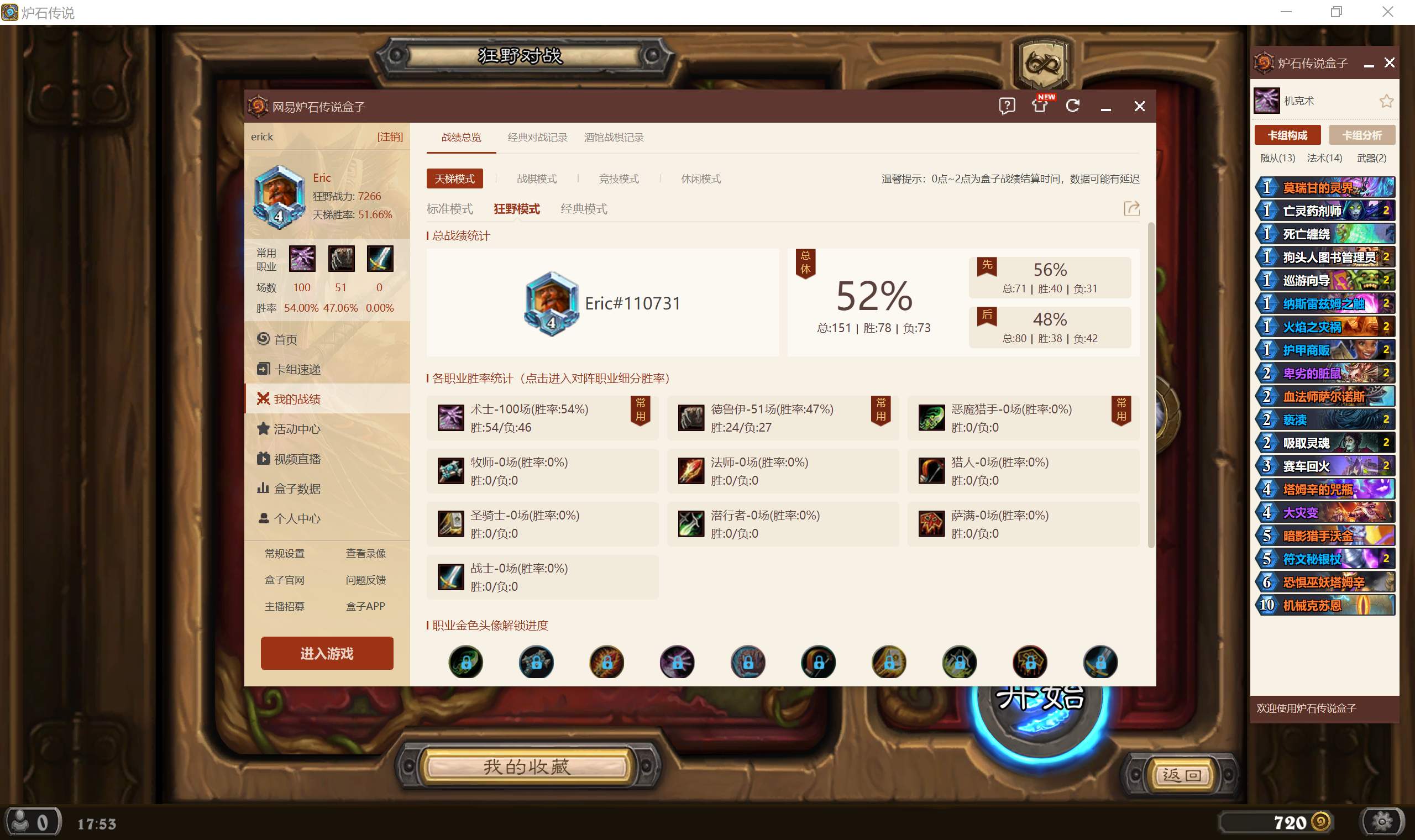炉石传说机克术100把胜率统计及卡组心得如下: