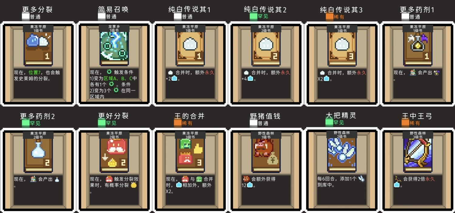 该流派选择买射全场书是为了缓解爆仓压力。合成王弓后不建议抓动物,优化史莱姆合成。后期如果用不完可以买王弓翻倍书。