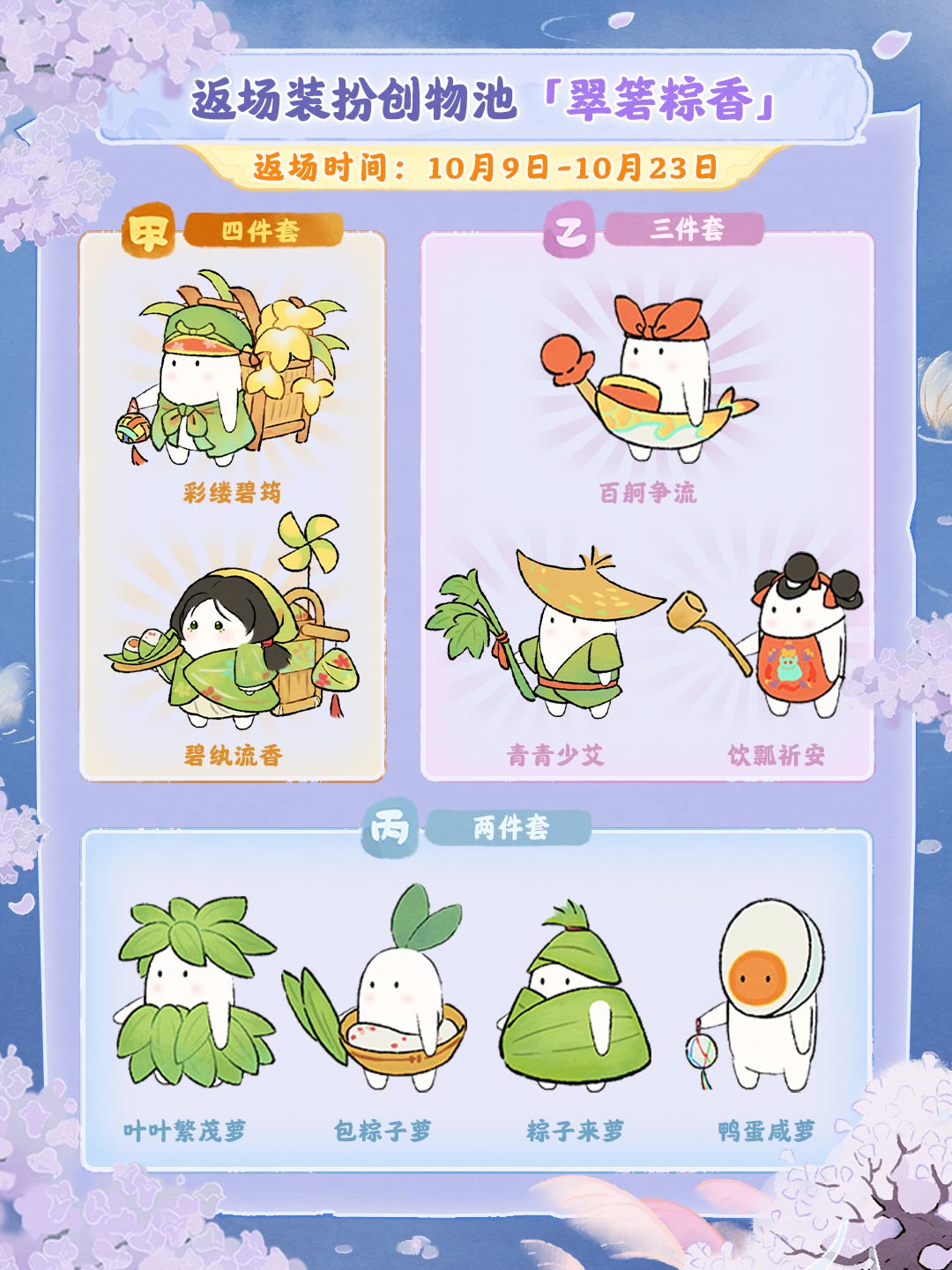 各位萝萝山山民好呀!「饮月幻花」建筑创物池、「翠箬粽香」装扮创物池以及「明月共我归」山遇,将于10月9日开始限时返场,感兴趣的山民们不要错过萝!