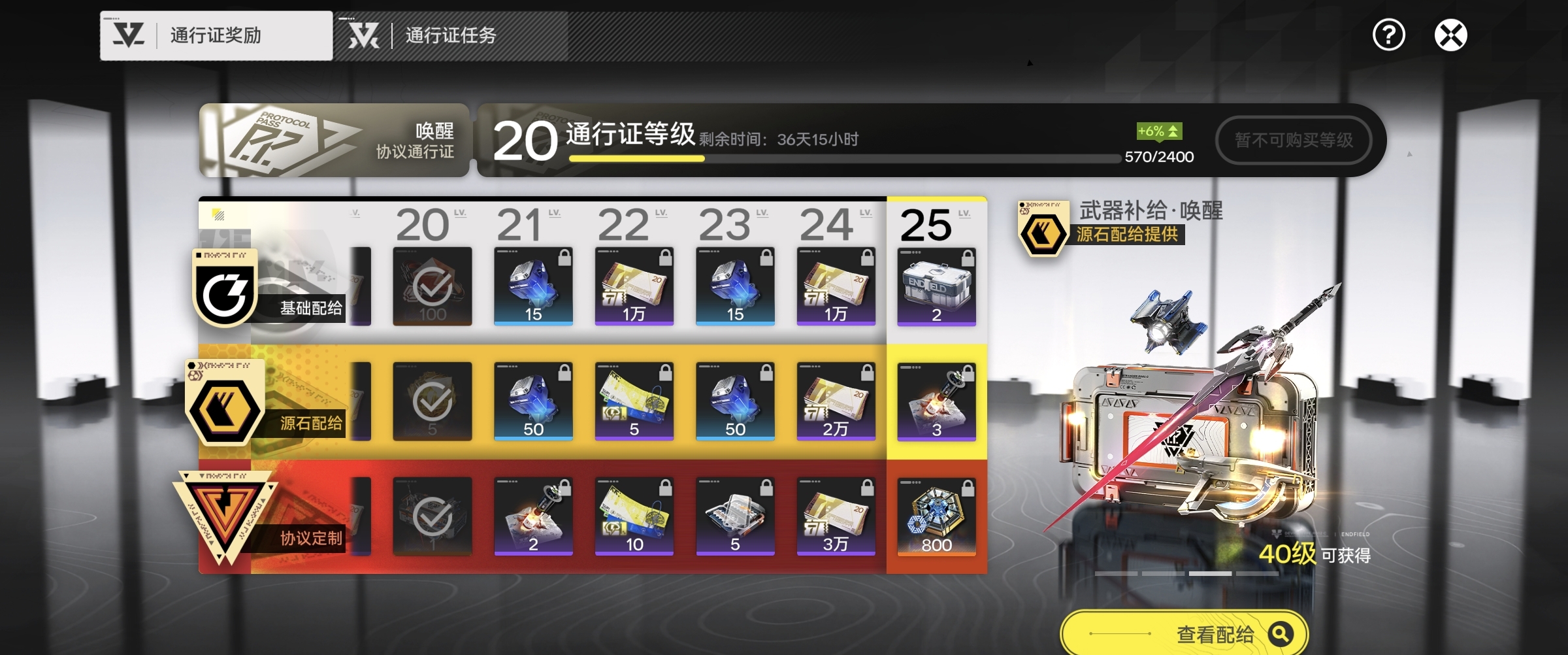 此外,新手6元首充可赠送6颗源石及1把六星武器,性价比相当高。主线及各类活动渠道仍会赠送大量源石,尽管源石购买力不及《明日方舟》,但只要愿意消耗源石购买二级通行证,长线体验会优于其他同类竞品。鹰角通行证分为三个等级,二级通行证需用源石购买,且通过完成每日活跃度任务可返还等量源石,相当于“白嫖”通行证福利。