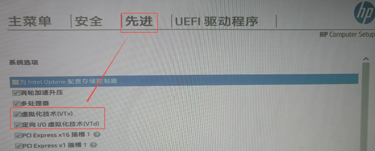 惠普:开机界面连续短按“F10”进入bios页面,选择“先进”、“系统选项”