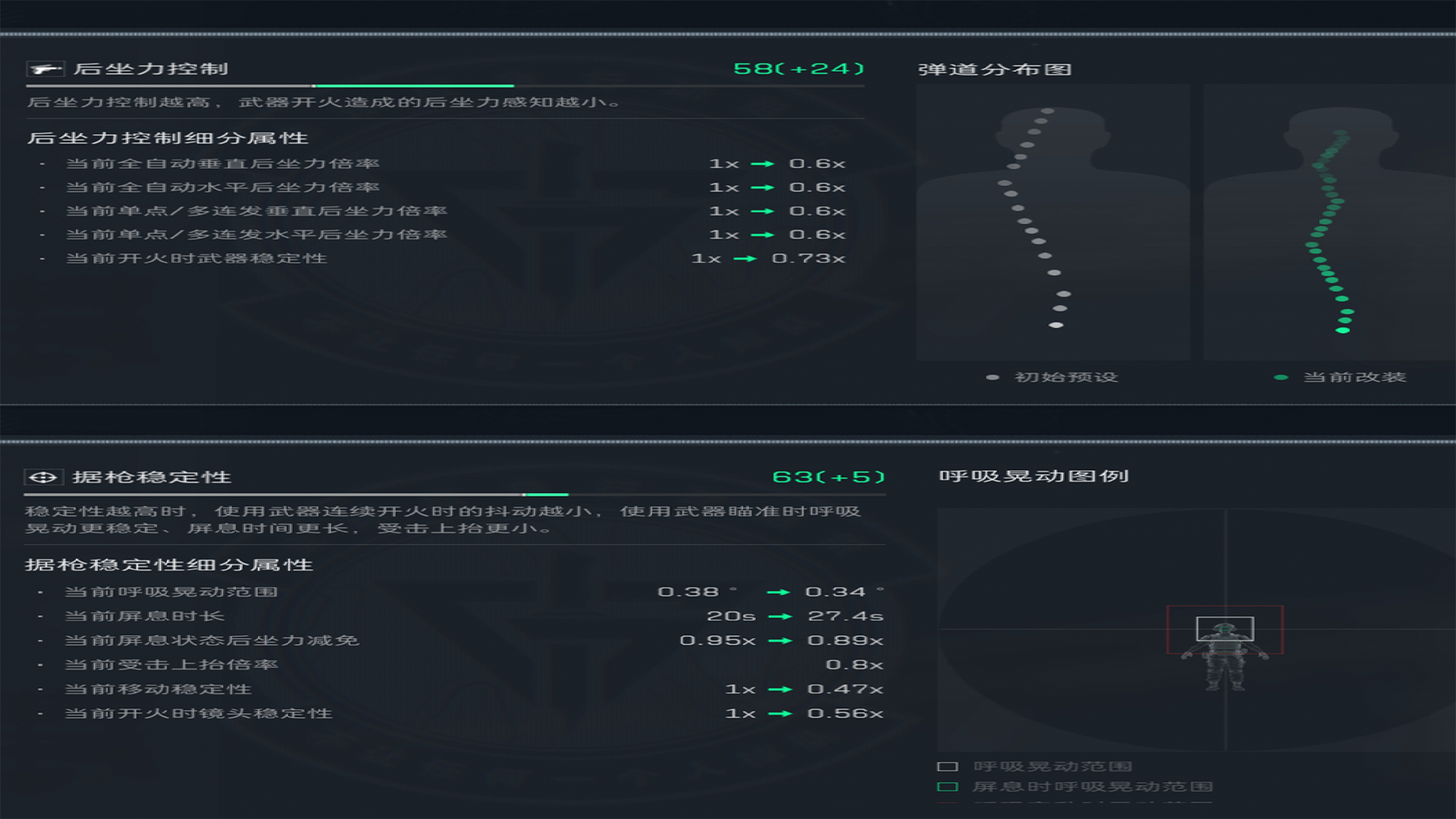操作性:后坐力控制属性增强据枪稳定性也有提升。具体表现为呼吸晃动范围缩小,屏息时长延长,屏息状态后坐力减免提升,受击上抬倍率降低,移动稳定性和开火时镜头稳定性增强,使枪械在射击时更稳定,操作手感更佳,射击精度更高。