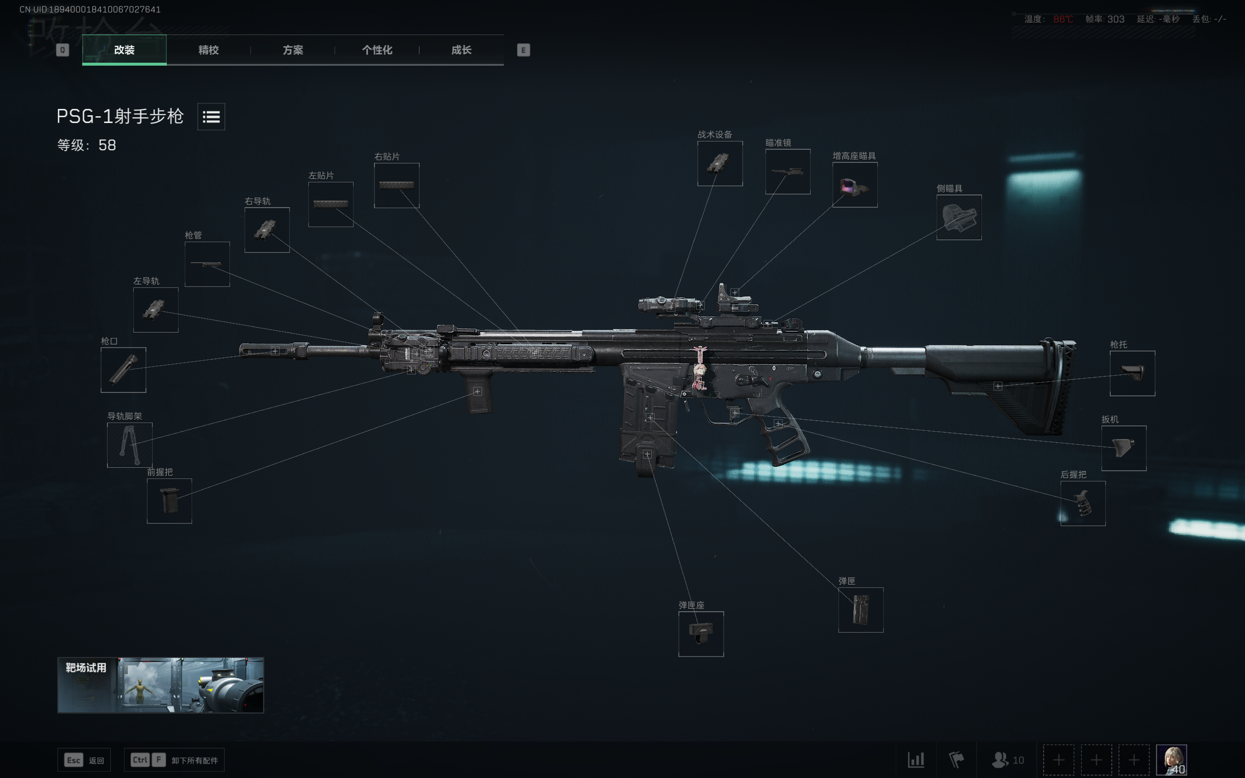 手感与总结:这把改装版的PSG-1射手步枪手感沉稳,后坐力控制良好(83),射击时枪口上跳与偏移小,弹道稳定易控;但射速较慢(353发/分),操控速度偏低(38),开镜与移动略显迟缓,腰**度一般(34),整体更适合中远距离精准点射,而非近战或快速机动作战。