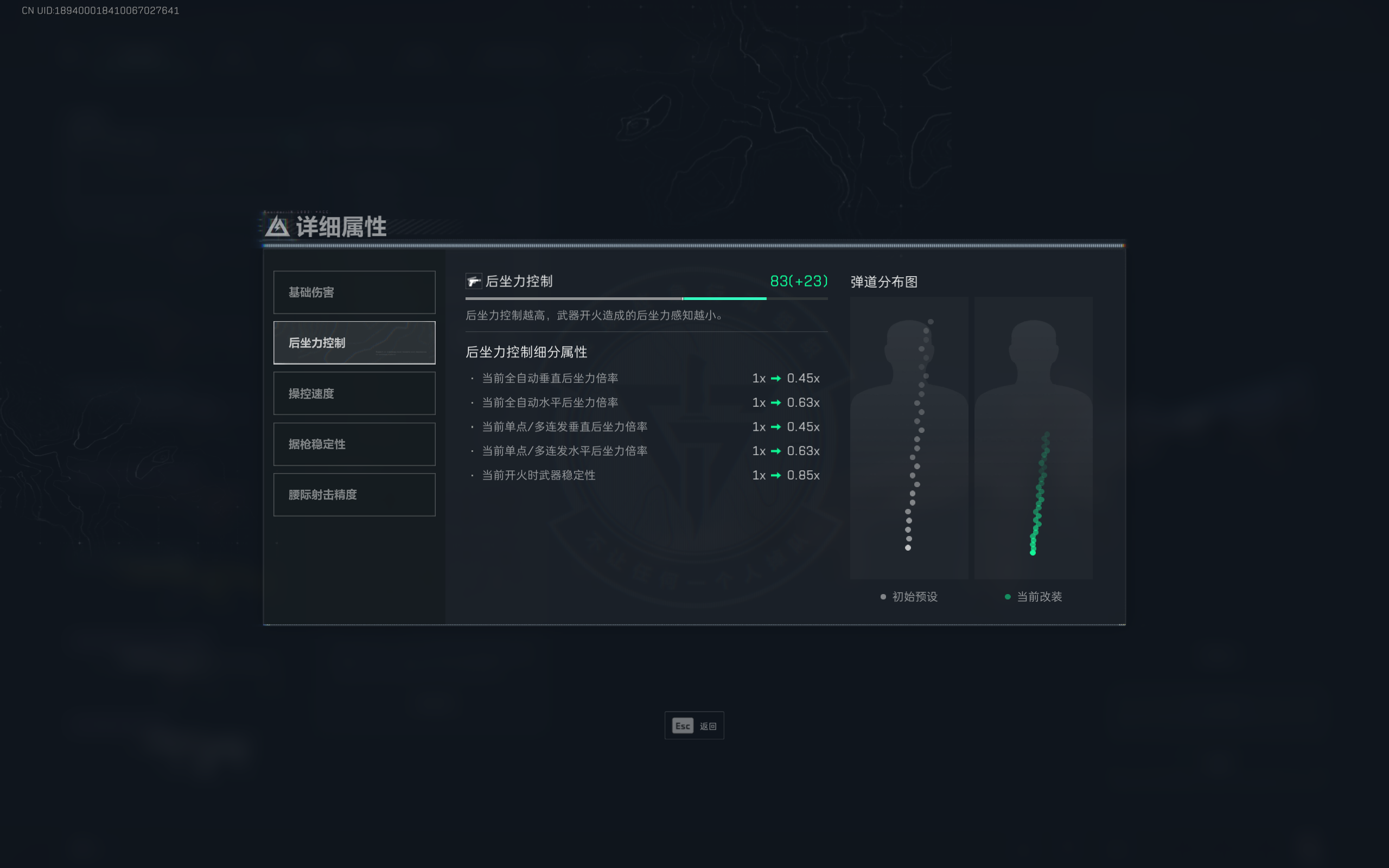 后坐力控制全面优化:后坐力控制属性达到83(较初始状态降低23),表明武器开火时的后坐力感知大幅减小。