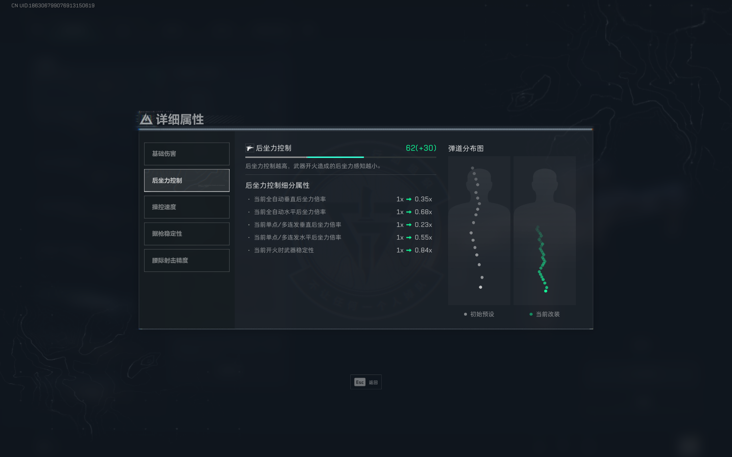 弹道:弹道变化特点是相较于初始预设,当前改装后的弹道更加集中。增强了后坐力控制效果,后坐力控制数值从 32 提升到 62(+30),细分属性中全自动垂直/水平后坐力倍率、单点/多连发垂直/水平后坐力倍率以及开火时武器稳定性都得到了改善。