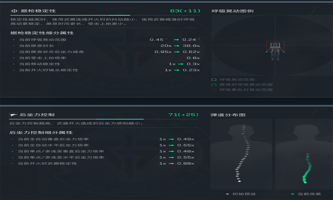 弹道:与初始预设相比,当前改装后的弹道更加集中,散布范围明显减小。这表明枪械在射击时的精度有所提高。
