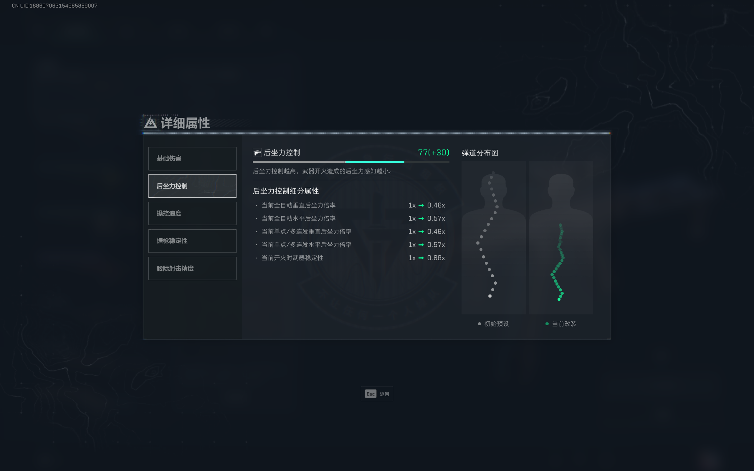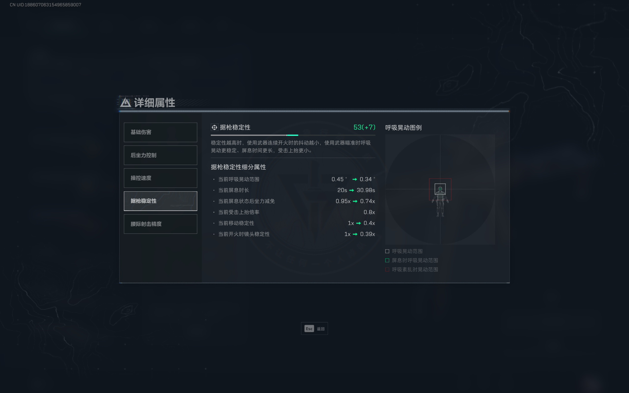 稳定性:据枪稳定性数值从基础值提升到 53(+7)。稳定性越高,使用武器连续开火时的抖动越小;使用武器瞄准时呼吸晃动更稳定、屏息时间更长,受击上抬更小。