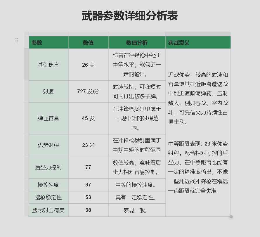 手感与总结:QCQ171冲锋枪,射速快(727发/分),能在短时间内倾泻大量子弹;后坐力控制数值较高(77),弹道相对集中可控。手感上,射击节奏迅猛,弹匣容量(45)提供持续火力输出保障,操控中能感受到其火力猛、易上手,适合近战刚枪等追求快速压制的玩家;但优势射程仅23米,远距离作战乏力,不适合偏好远程精确打击的玩家。整体是一把近战凶悍、便携且火力强劲的冲锋枪。