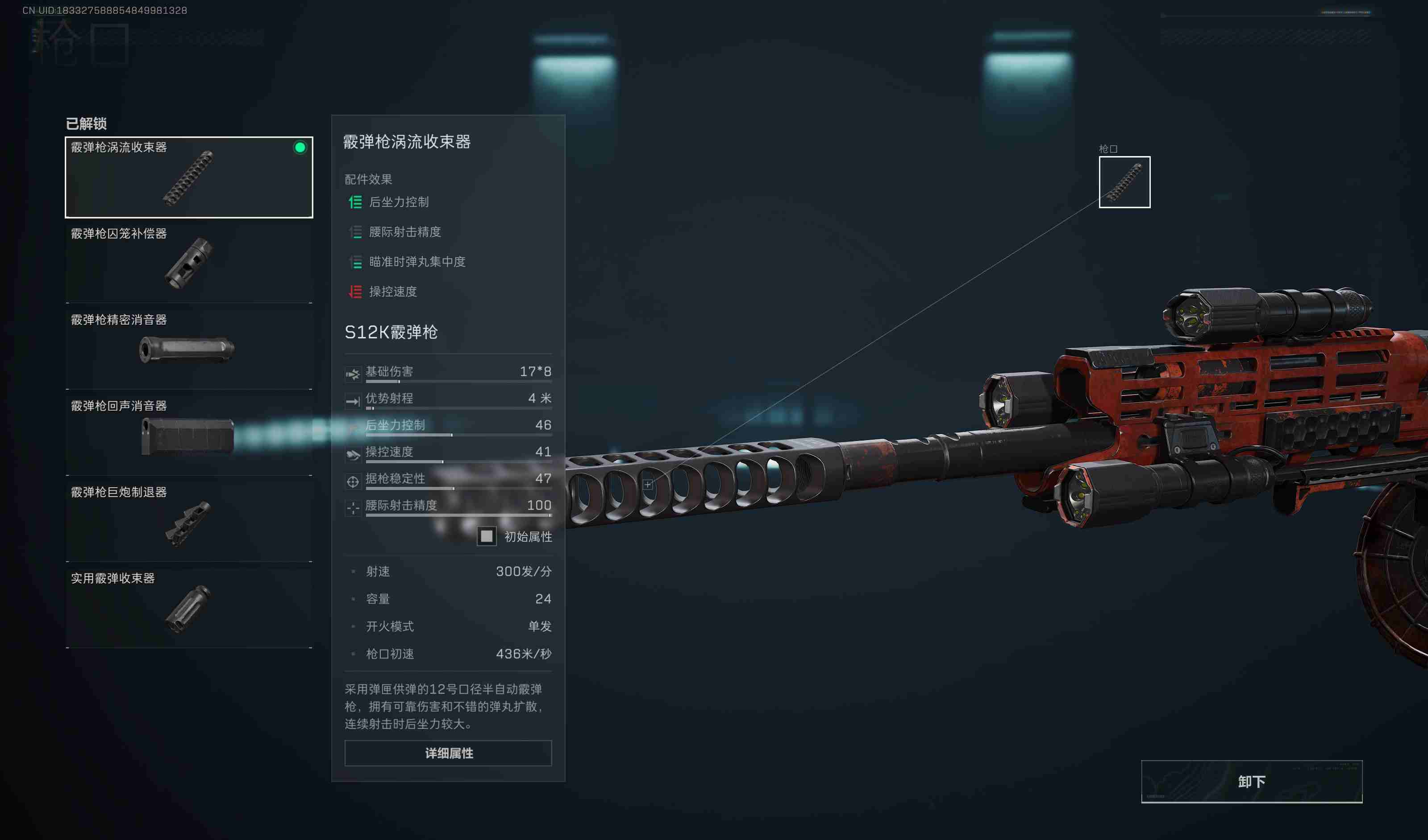而在枪口部分,我们需要安装霰弹枪涡流集束器,集束器可以帮我们收束子弹,使霰弹打的更集中,造成的有效伤害更高,同时也提供属性加成。