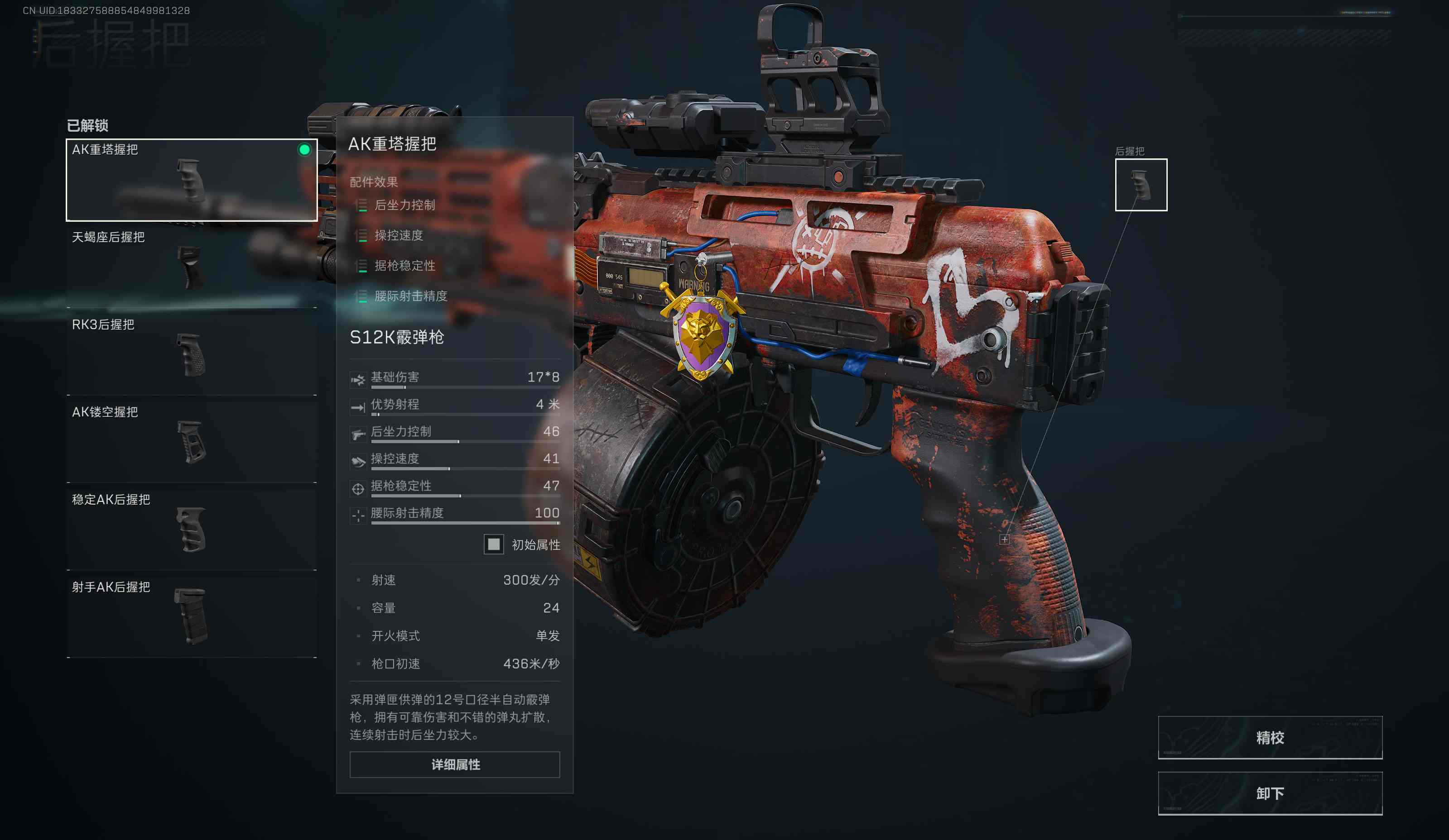 首先介绍核心配件,AK枪托尾盖,这个配件可以增加大量的操纵速度和腰射数值, 真正做到扳机无延迟,免开镜射击,让我们在狭小空间内获得大量优势,不过这个配置对操作者提出了更高的要求,因为这把枪是半自动的,强度上限完全取决于点击鼠标的快慢,还有一个小诀窍,可以使用物理外挂,如果你的鼠标是无极滚轮,那就可以把开火绑定到滚轮上,实现全自动开火。