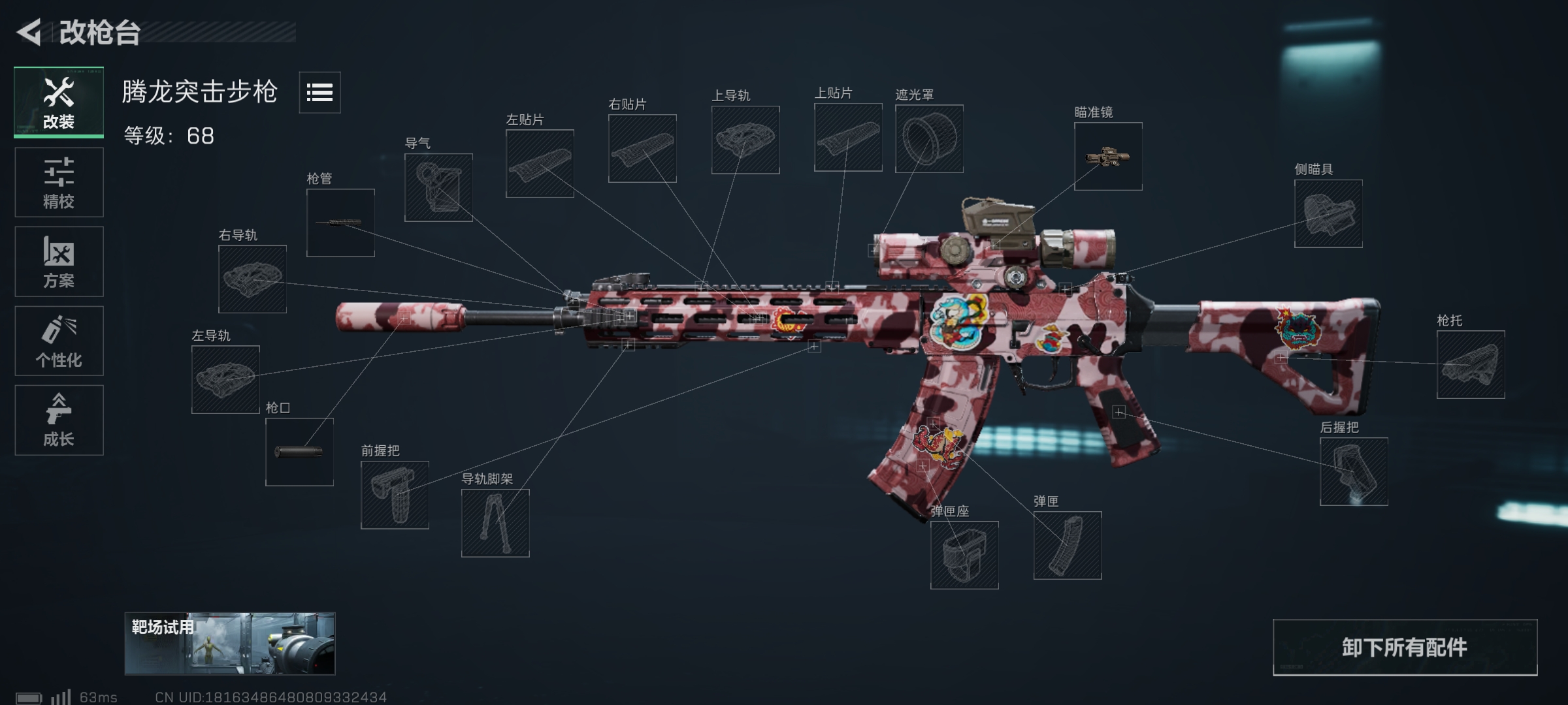 然后枪械数据界面里,射程一会34一会39,不测试根本看不出问题。正常上版本腾龙小导气就有bug,轻语+长枪管+小导气+精校射程能到47,事实也确实能到47,爆杀其他枪,优势射程能高出AK和m4两个身位。不加轻语,装长枪管+小导气+精校也能射程事实达到44,至少能高出那二位一个身位,所以强。