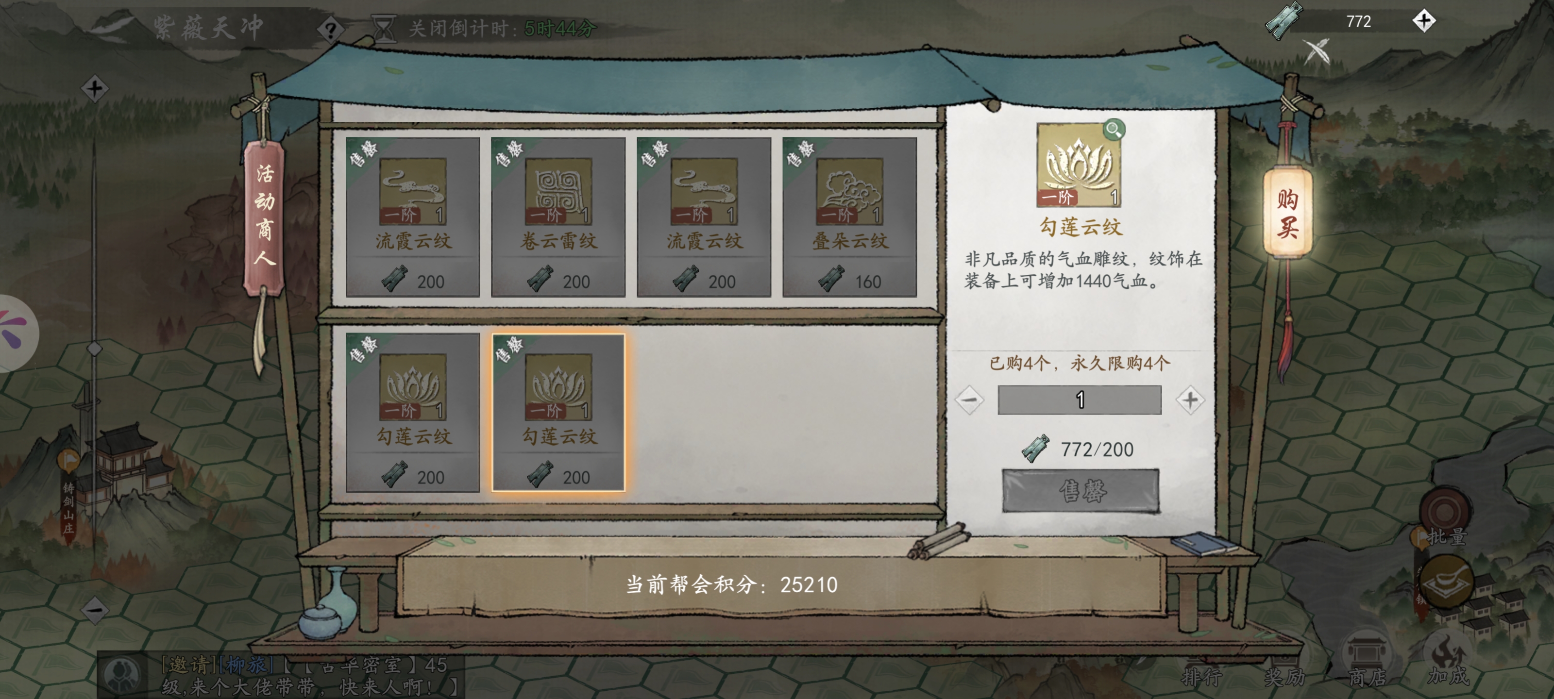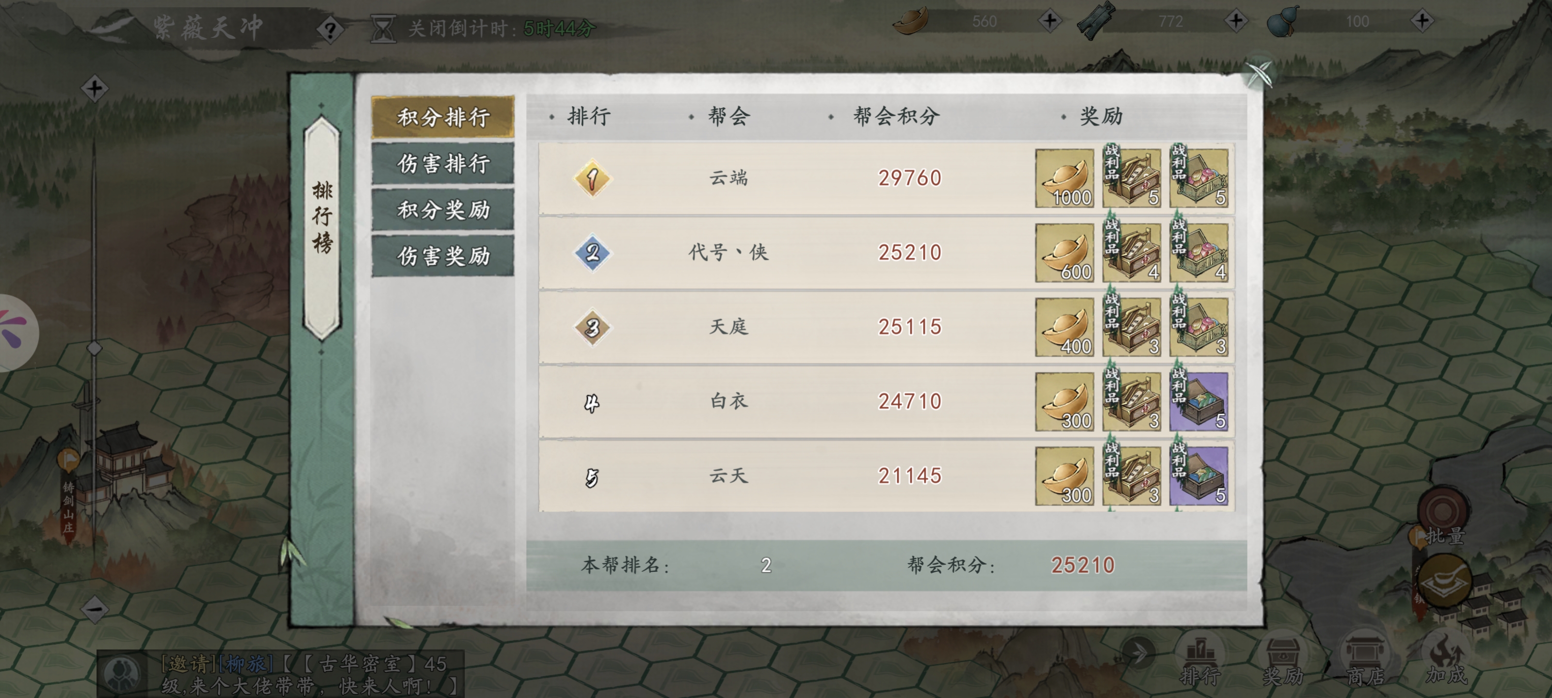 第一天开启活动后,召集帮派成员,抢首杀,可以获得大量积分,因为每个怪都是在固定回合里必须打死,也就是对输出有了要求,前期可以推荐氪佬的唐门暗器,天山连击剑,天山刀,平民的血气棍,武当阵法,前期伤害都不低,新出的峨眉剑,人海战术,低战开地图,高战打大殿,首杀怪。
