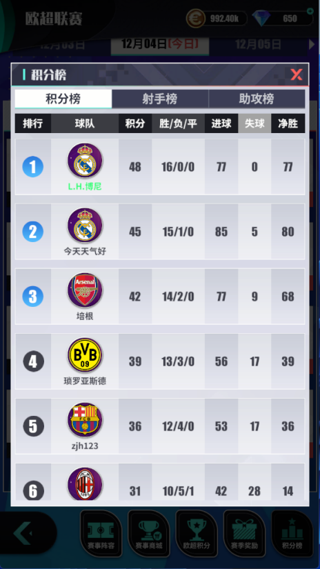 最后玩家可以在积分榜中看到自己的比赛结果,数据等,可以结合目前的赛程来调整阵容等,而且在积分榜中还可以看本赛季的射手榜,助攻榜。