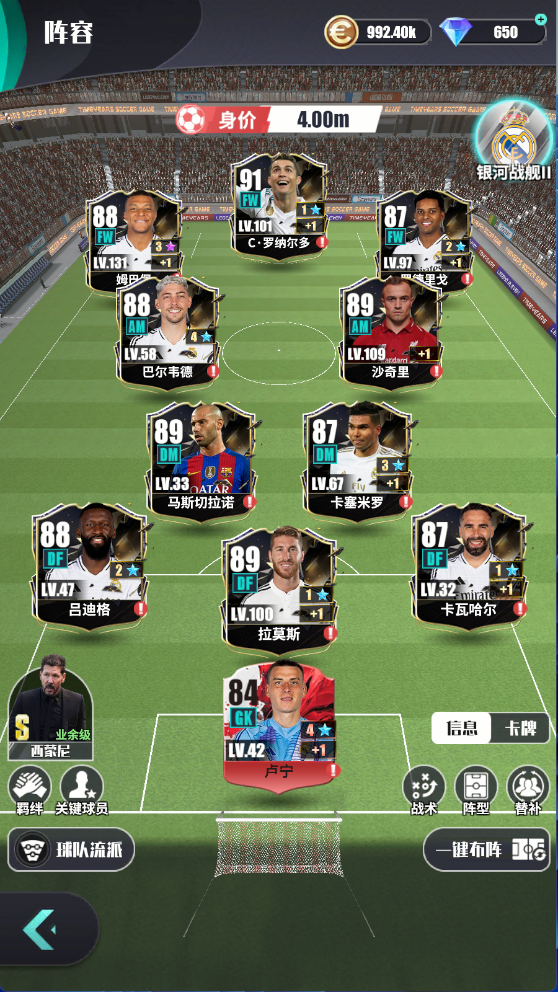 玩家可以在赛事阵容里调整自己在欧超联赛中的阵容。Ps:欧超联赛的阵容可以和生涯赛的阵容不一致,但是在升星或者其他系统中都会算做已上阵。