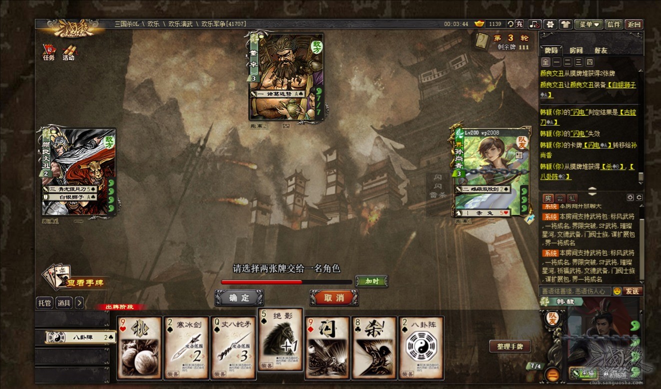 装备流武将比较适合,尤其是界香香,可以相互传递装备。给界夏侯惇等武将,可以触发分配牌技能。卖血武将也可以远距离配合。