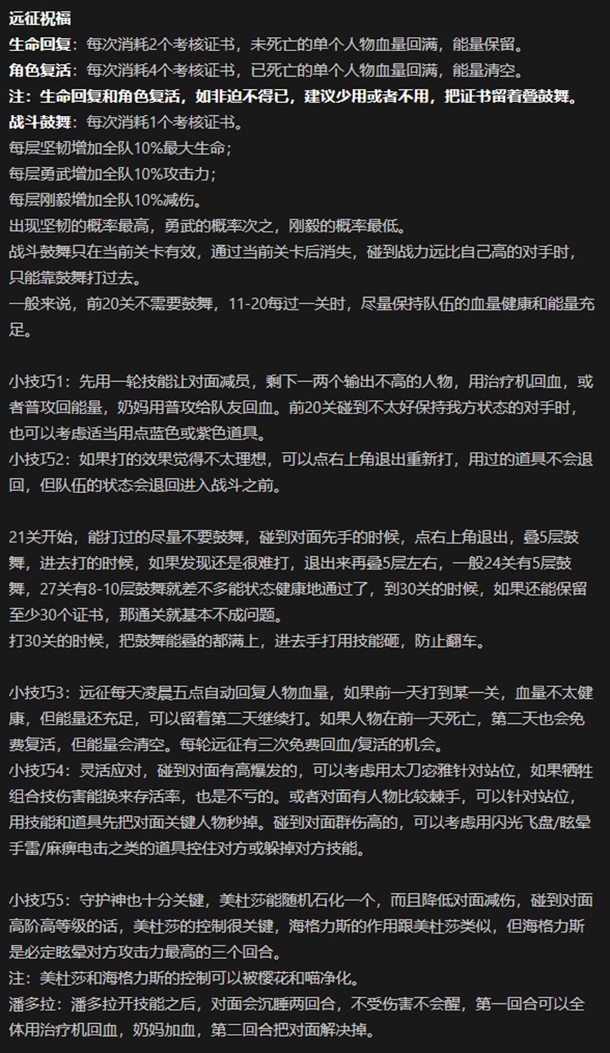 下面摘录的几篇帖子都是基础中的基础,请各位萌新花时间认真阅读,再结合笔者提供的技巧,基本都能稳定完成每次远征的第30关。