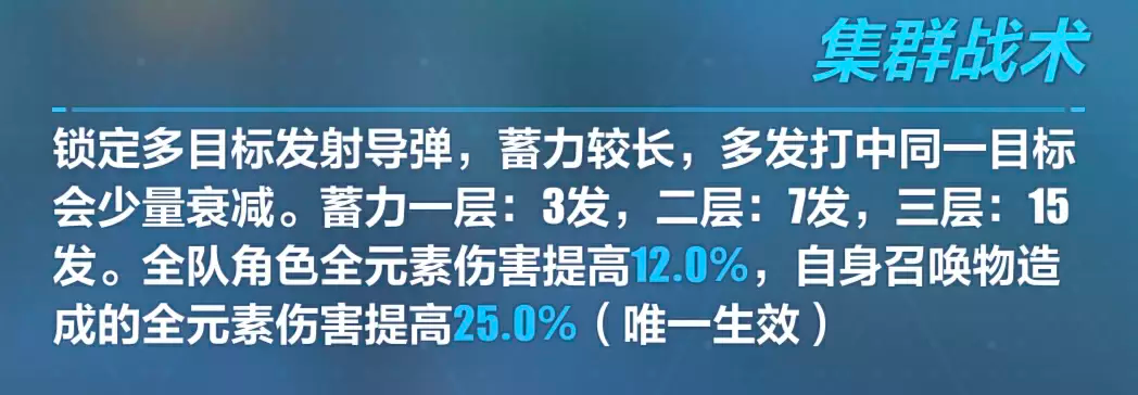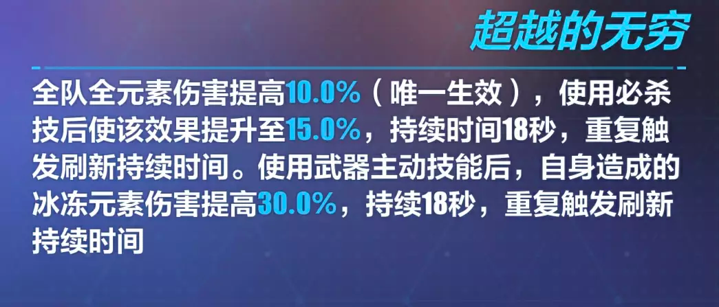 无条件提高全队的全元素伤害,装备者释放必杀技后,进一步提高该效果;使用武器技能后,提高自身冰元素伤害。