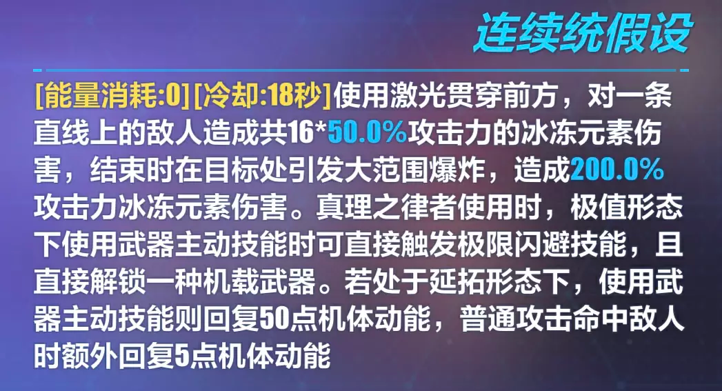 武器主动0SP消耗,18秒冷却,向前方射出一道激光,造成冰元素伤害。而当使用者为真理律时,释放武器技能将额外获得以下效果: