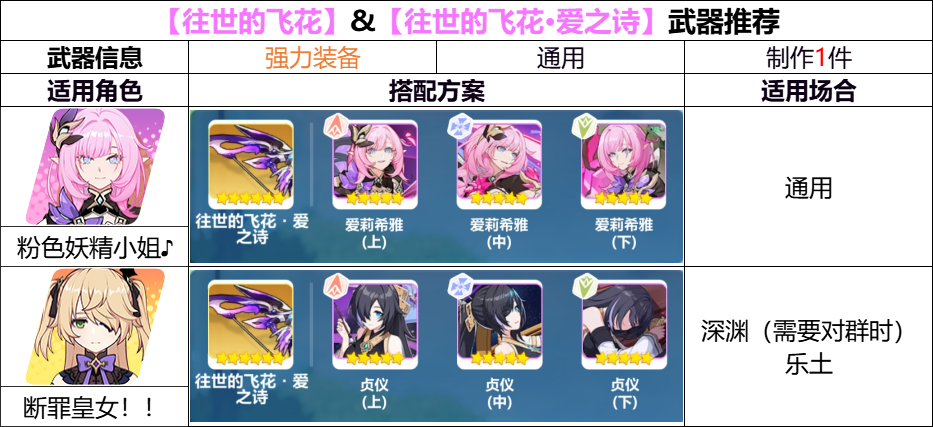 [往世的飞花·爱之诗]为'粉色妖精小姐'的输出毕业武器,提供了高额的加成和对复数敌人的[水晶花种]传播效果。