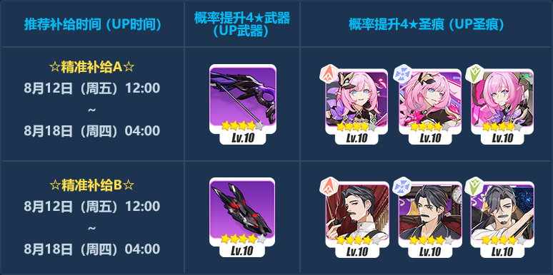 精准补给A、 精准补给B:新版本在即,均不推荐抽取这两个补给,并且精准补给A中的圣痕[爱莉希雅]套均为可肝圣痕。