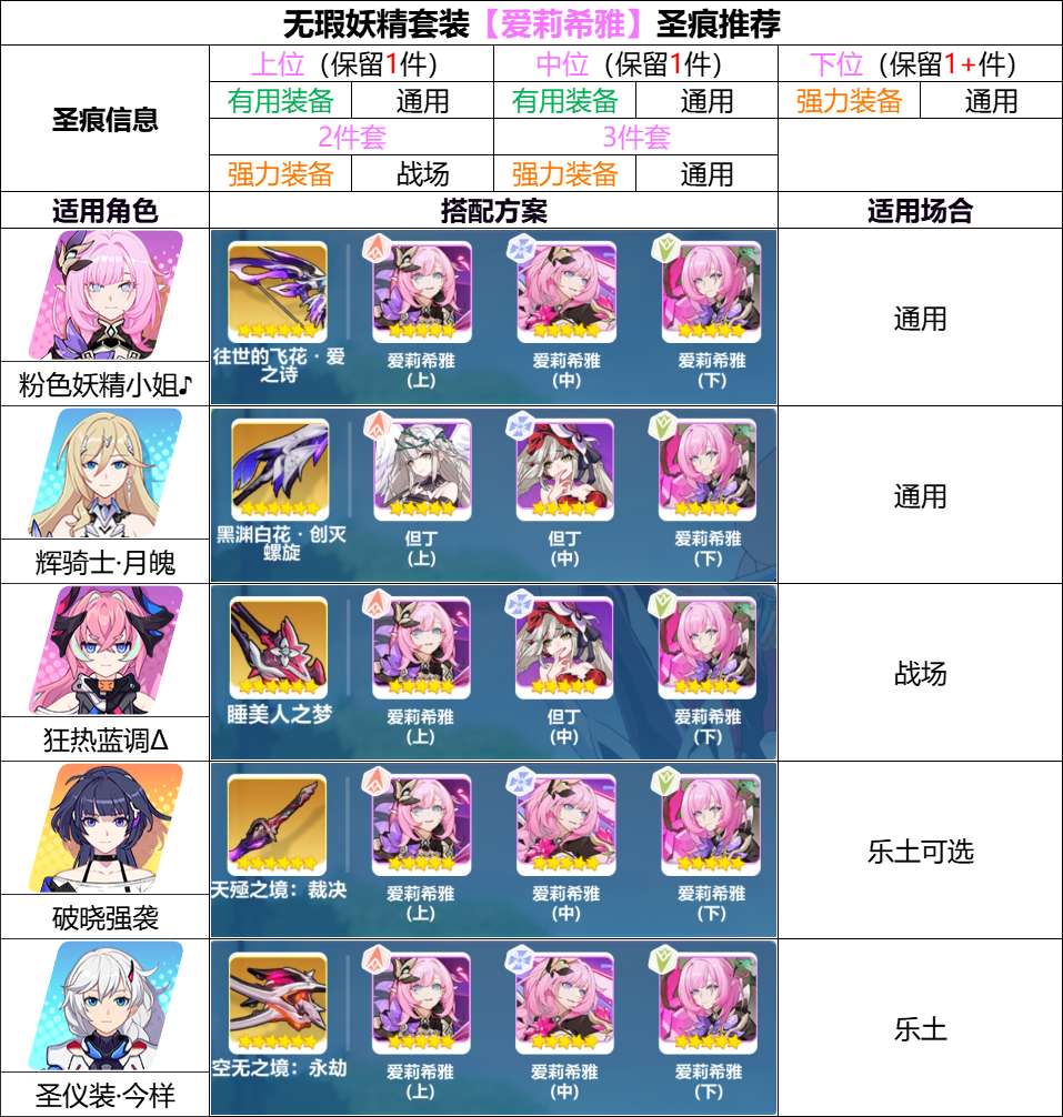 UP内装备[往世的飞花]+[爱莉希雅]套为'粉色妖精小姐'的推荐装备。[爱莉希雅]也是乐土中远程物理角色的优选圣痕。