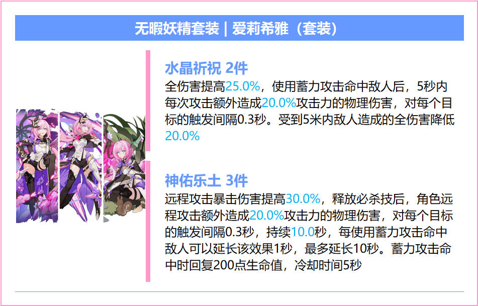 [爱莉希雅]一套为'粉色妖精小姐'的输出毕业圣痕,提供了非常高的暴击伤害加成。