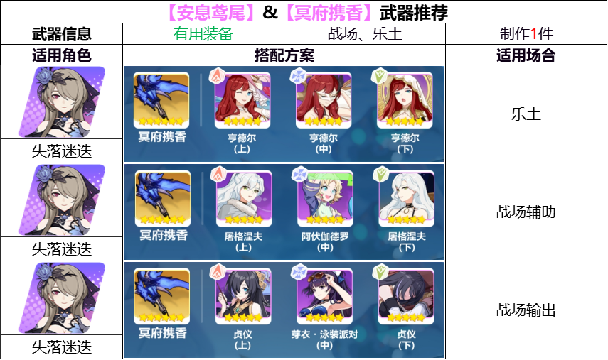 UP内装备[安息鸢尾]为'失落迷迭'的推荐武器,[艾琳·艾德勒]圣痕的使用场合较为有限,一般会在长线的辅助中考虑。