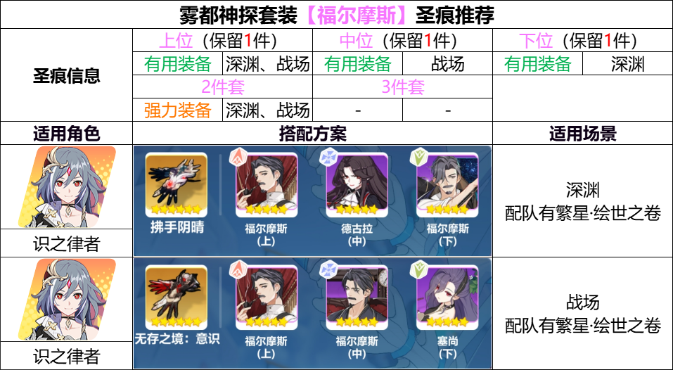 UP内圣痕[福尔摩斯]套为物理队伍针对流血状态特化的辅助装备,由于'繁星·绘世之卷'的出现,流血状态基本可以视作常驻,目前[福尔摩斯]2件套在深渊和战场一般由'识之律者'使用,有着很好的表现。