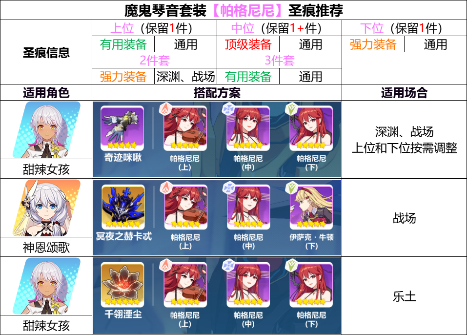 [帕格尼尼]一套为'甜辣女孩'的毕业圣痕,3件套提供了高额的全伤加成效果,并且2件套提供了高额的物理易伤效果,可以与其他圣痕散搭使用,圣痕触发方式与'甜辣女孩'的机制非常契合。