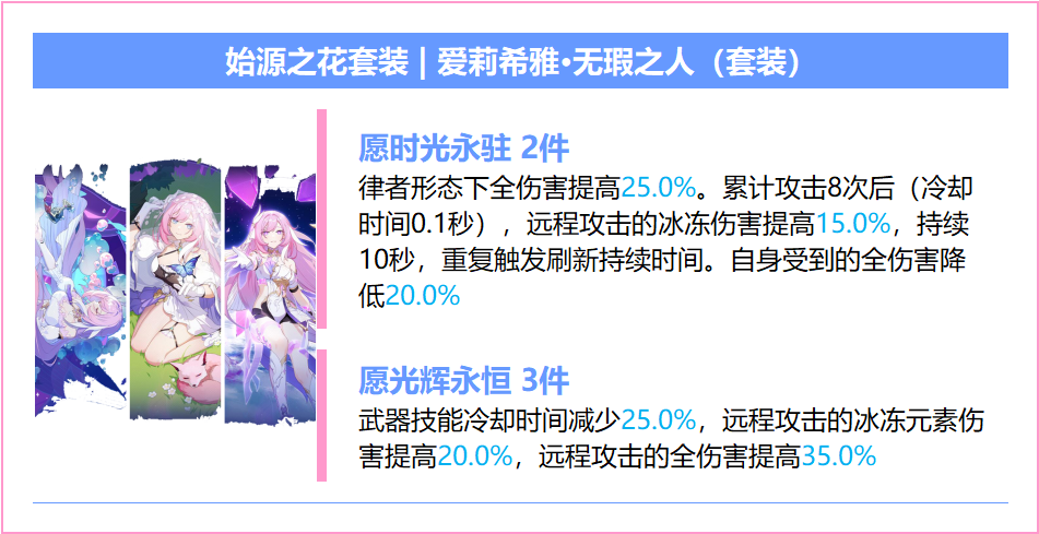 [爱莉希雅·无瑕之人]一套为'真我·人之律者'的毕业圣痕,提供了高额的伤害加成,并且3件套还能减少武器冷却时间,在续航方面比其他配置有较大优势。