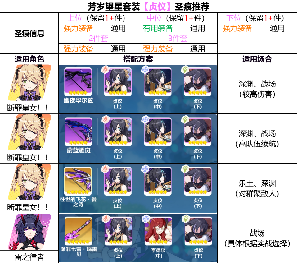 [贞仪]一套为'断罪皇女!!'的推荐圣痕,使用[贞仪]一套的'断罪皇女!!'对于雷属性输出角色而言,其辅助加成效果与[屠特屠]相仿,但是[贞仪]一套本身能提供更高的自身加成及续航能力,但是部分情况下可能受制于圣痕冷却的问题无法完全发挥。