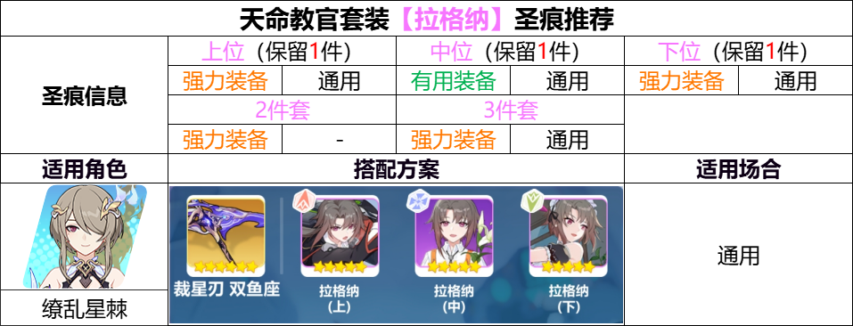 [拉格纳]一套为'缭乱星棘'的输出毕业圣痕,整套圣痕对'缭乱星棘'有着非常不错的加成。如果无法凑齐一套也可以使用[拉泰拉],与[拉格纳]一套的差距不大。