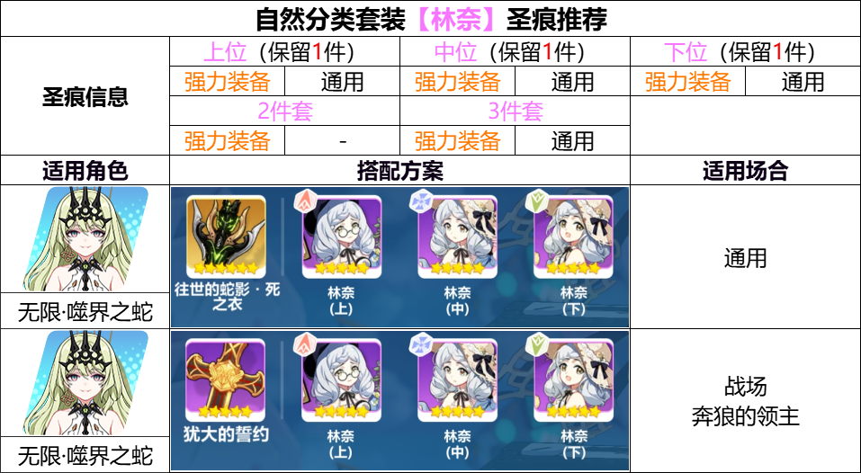 UP内装备[往世的蛇影]+[林奈]套为'无限·噬界之蛇'的推荐装备。[林奈]也是乐土中有自身召唤物的雷元素远程输出角色的优选圣痕。