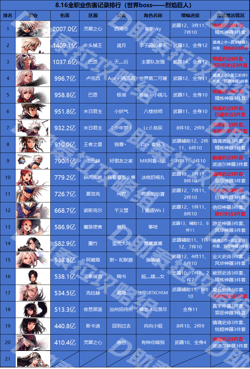 注:因区服太多以及练习模式成绩可能没有及时记录,部分职业会有更高的伤害,以上成绩都有实际伤害截图数据,由于其他两个世界boss受关注度较低,本周还是统计的石巨人的伤害记录