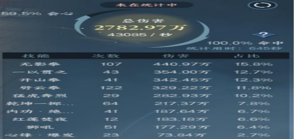 首先我自己打桩包括技能携带型,无影拳/一以贯之/开山拳/狮吼/乾坤一掷/蜜语含香/心锋/红莲焚夜这里如果带剑破乾坤的伤害是要比红莲高的,可这剑破一般轮不到铁衣来带。所以我们选择更为稳妥的红莲焚夜。