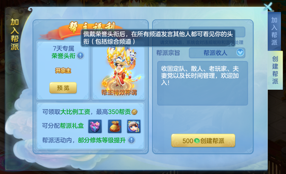 1)新增了限时荣誉头衔“开宗主”,帮主创建帮派时可获得;