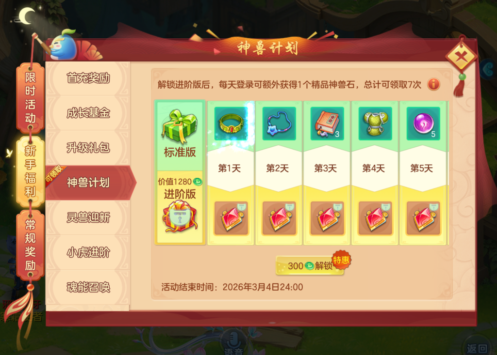 6、神兽计划:限“一马当先”及后续服务器生效,持续登录获得奖励,解锁进阶版后能额外获得精品神兽石奖励。