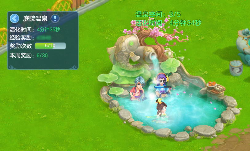 庭院商城新增庭具温泉,消耗仙玉可使温泉进入10分钟活化状态,期间好友、同帮成员可一同进入并获得少量经验奖励。